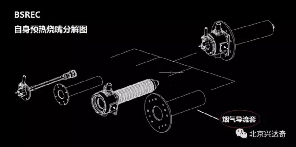 自身预热烧嘴又称换热式烧嘴,它是将燃气入口、助燃风入口、点火电极、燃烧室、换热器和排烟口组合成一个整体的燃烧装置。自身预热式烧嘴的使用替代了烟道热交换器,无需额外占地面积且热利用效率更高。