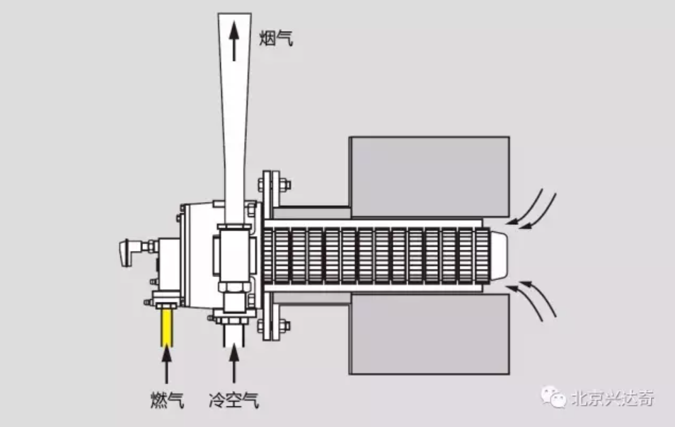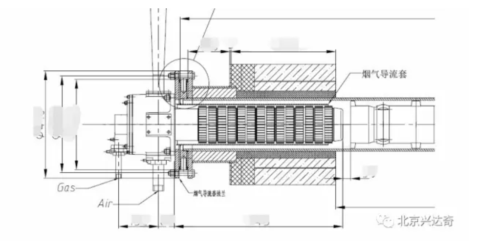 在间接加热应用时,烟气可以通过换热器与辐射管的间隙排出炉膛,从而实现热量的交换。在明火加热时,我们也需要加装烟气导流套来强制烟气在这个环形间隙中通过,实现最大程度的热交换。