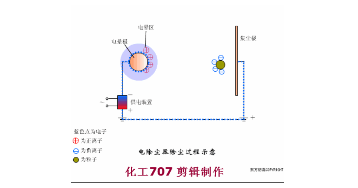含有粉尘颗粒的气体,在接有高压直流电源的阴极线(又称电晕极)和接地的阳极板之间所形成的高压电场通过时,由于阴极发生电晕放电、气体被电离。此时,带负电的气体离子,在电场力的作用下,向阳板运动,在运动中与粉尘颗粒相碰,则使尘粒荷以负电,荷电后的尘粒在电场力的作用下,亦向阳极运动,到达阳极后,放出所带的电子,尘粒则沉积于阳极板上,而得到净化的气体排出防尘器外。