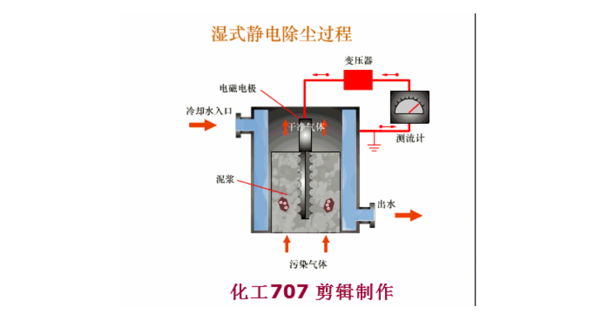 收尘极捕集的粉尘,采用水喷淋或用适当的方法在除尘极表面形成一层水膜,使沉积在除尘器上的粉尘和水一起流到除尘器的下部而排出,采用这种清灰方法的电除尘器称为湿式电除尘器。